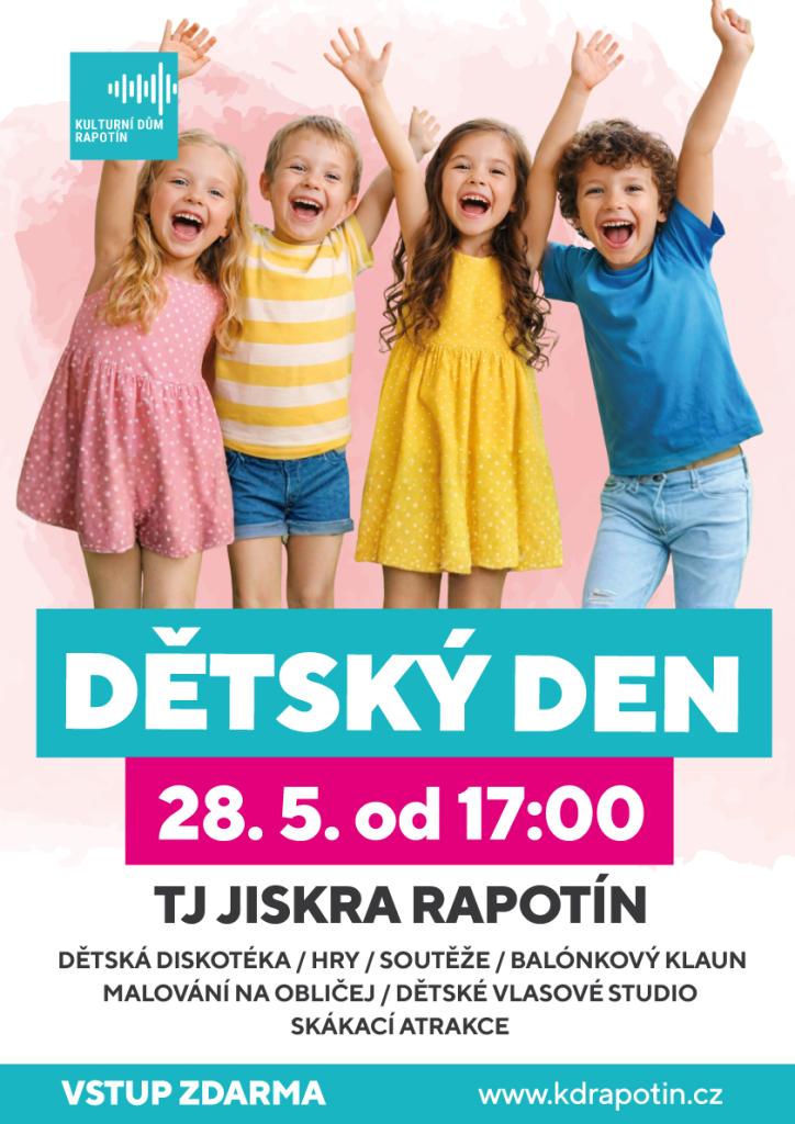28. 5. oslavíme společně s našimi nejmenšími dětský den. Akce se bude konat v areálu TJ Jiskra Rapotín. Děti se mohou těšit na diskotéku, hry, soutěže, skákací hrad a mnoho dalšího.