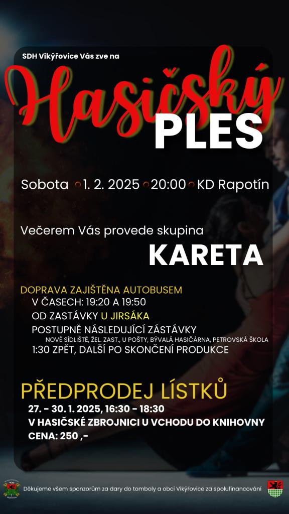Předprodej vstupenek 27.-31.1. 16:30-18:30 v Hasičské zbrojnici Vikýřovice, vchod od knihovny.