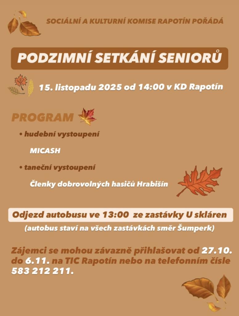 Zájemci se mohou závazně přihlašovat od 27. října do 6. listopadu na TIC Rapotín nebo na telefonním čísle 583 212 211.